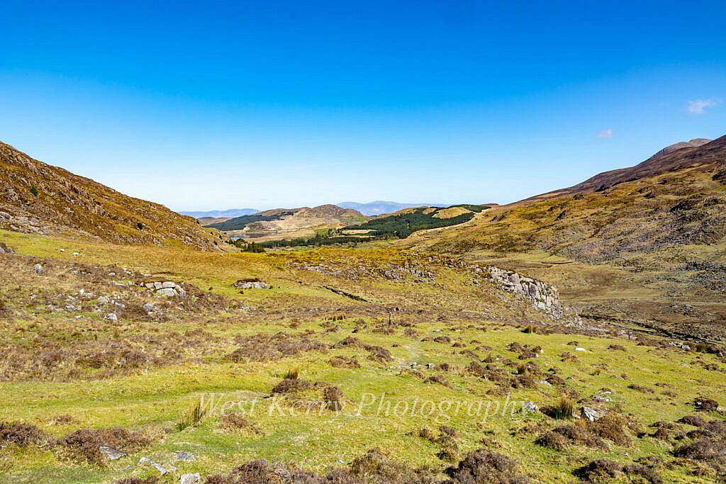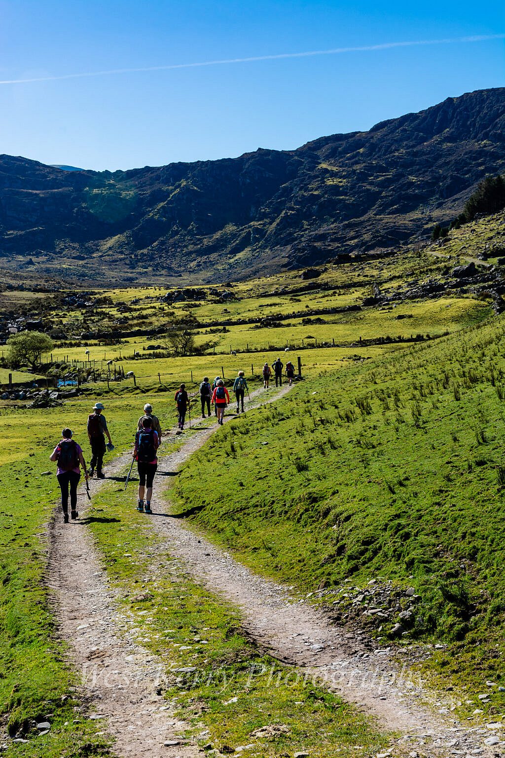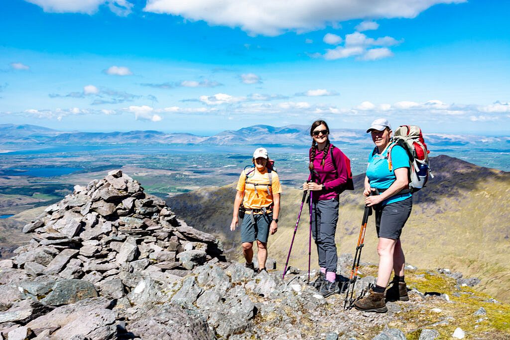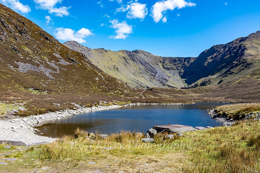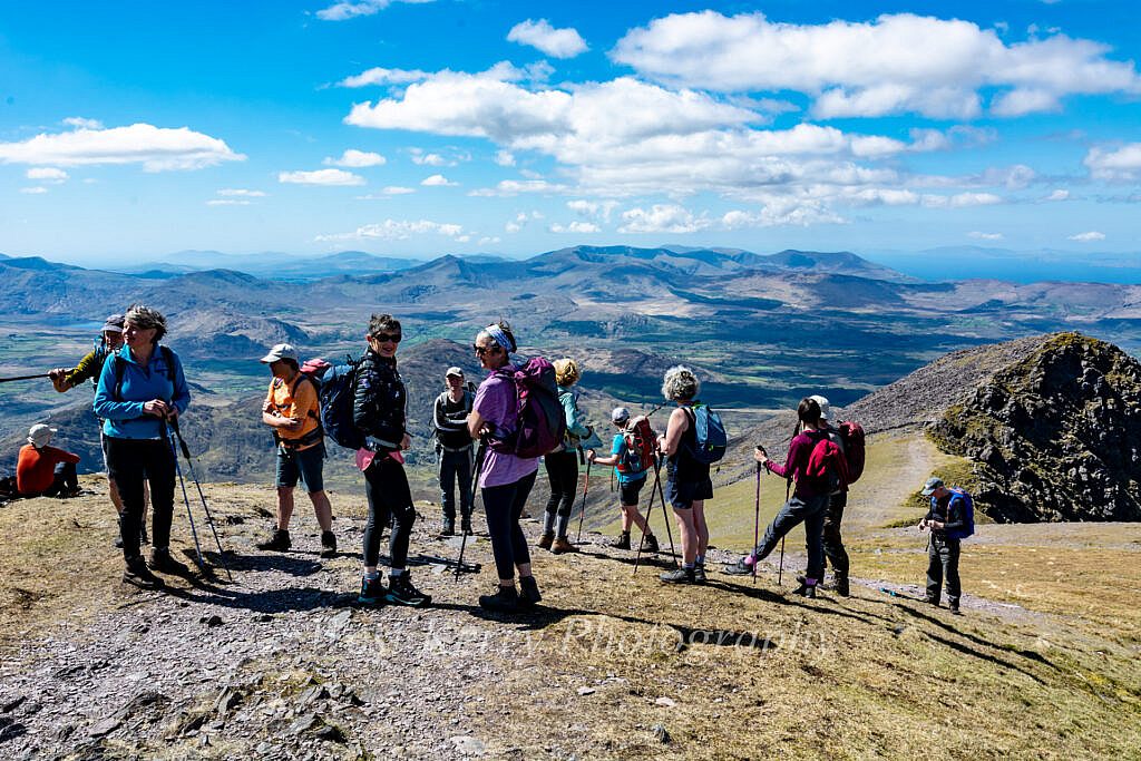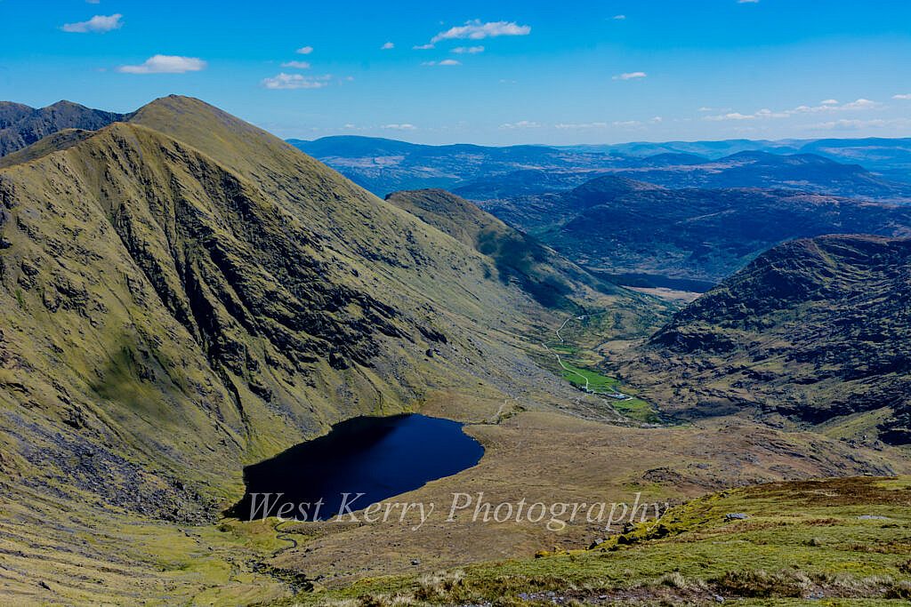 Following the Kerry way along the floor of the picturesque Gearhanagour stream valley through a working farm and past some abandoned stone cottages before an ascent of some 200m to a col where we meet the Lack road which rises from the Bridia valley. At this point we leave the Kerry way and start a long steady ascent to the N.East and An Currach Mór (822m). From the summit we overlook Curraghmore lake which is surrounded by imposing looking cliffs and the Eastern Reeks ridge looming in the distance. Looking down towards the junction of the Black and Bridia valley we can look forward to the 200m at times steep ascent to Caher (1,001m). Carrauntoohil in all its glory 1.5km further on.