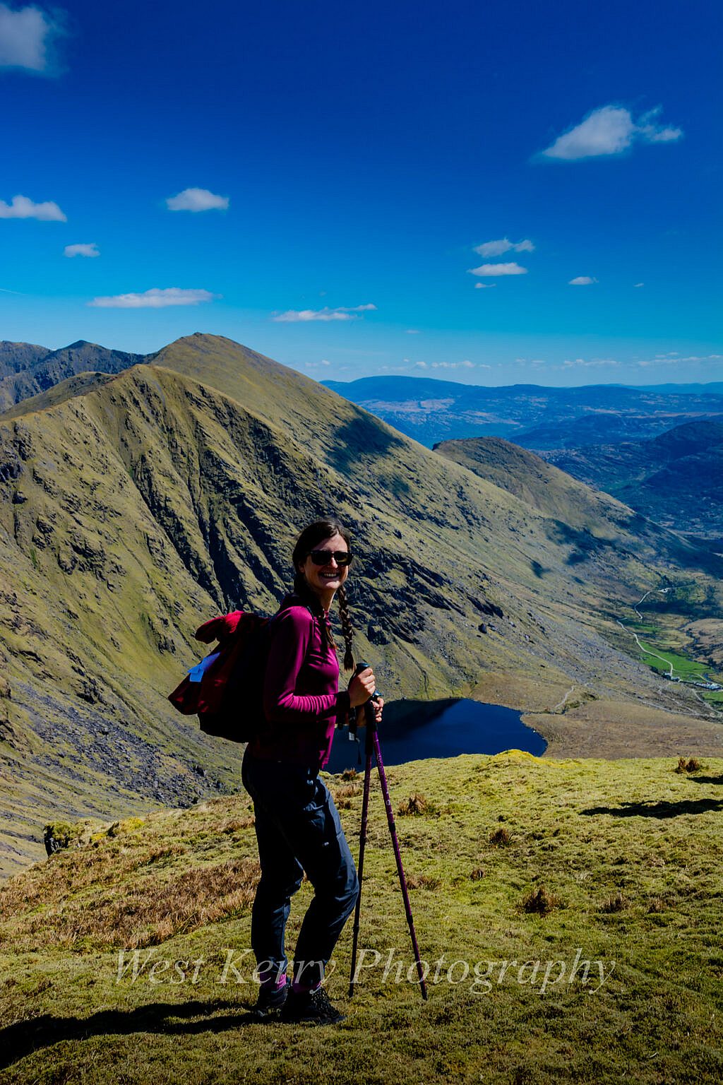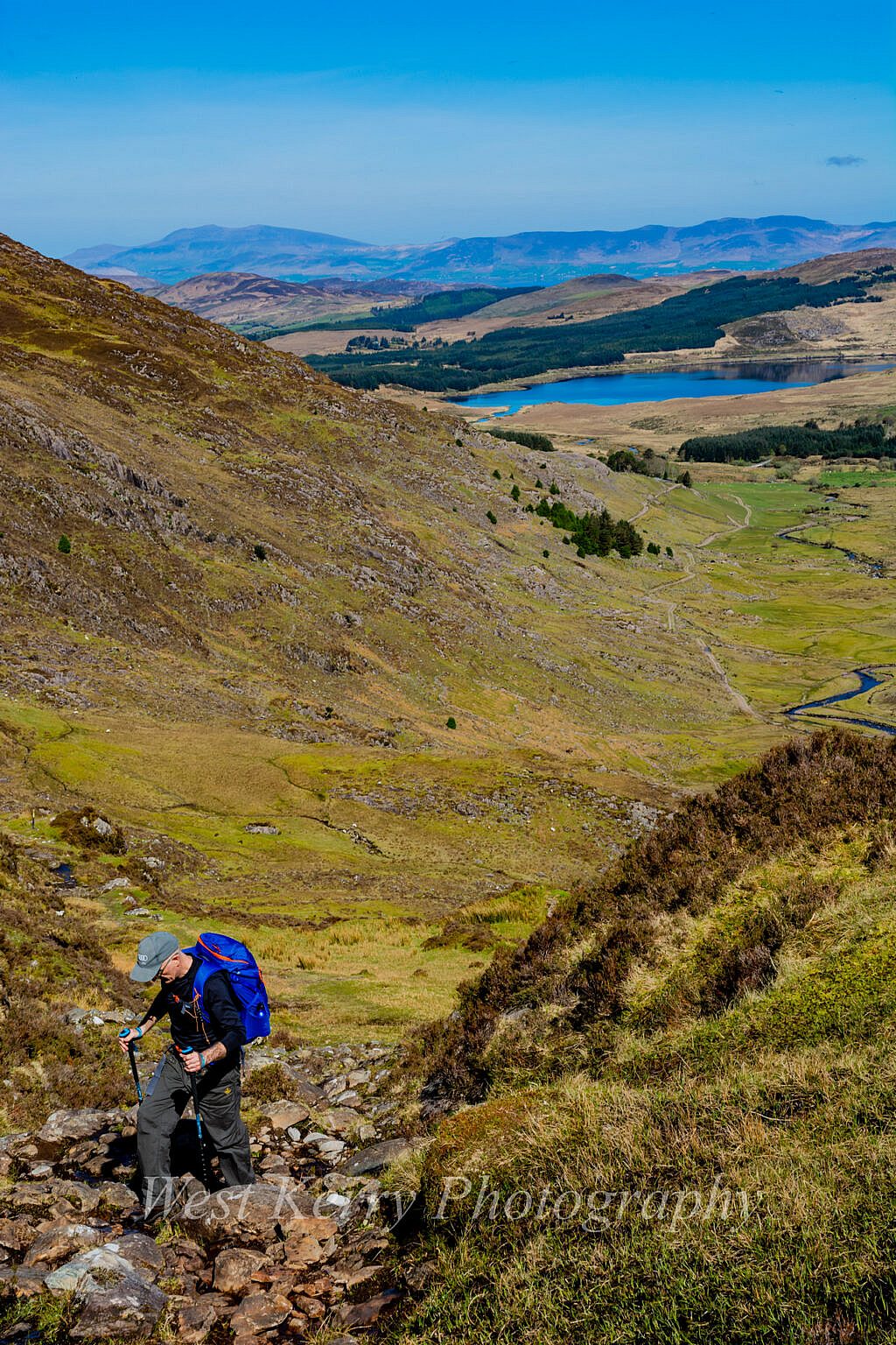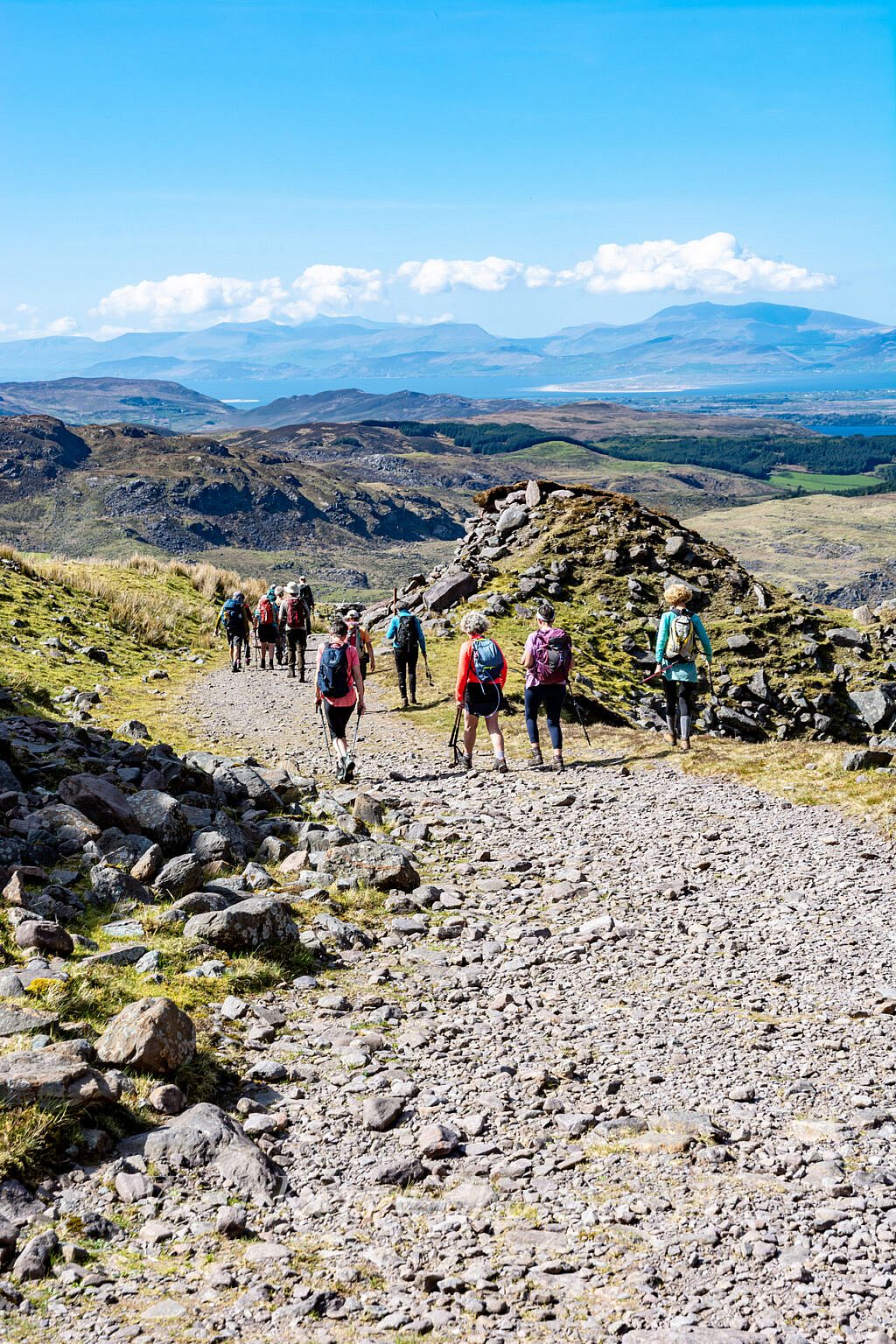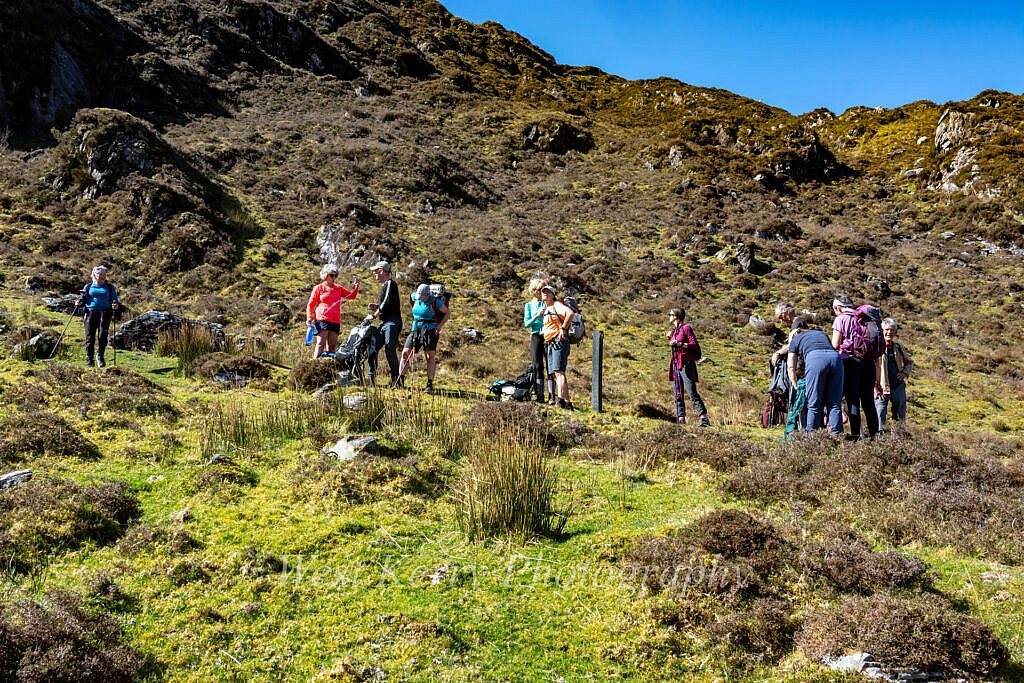 It is all downhill from here!. A steep descent over rocky ground for a kilometre before a more gradual descent for the next kilometre over soft ground before making our way down to the shores of Loch Iochtar where we can take in the magnificence of the entire Coomloughra Horseshoe.