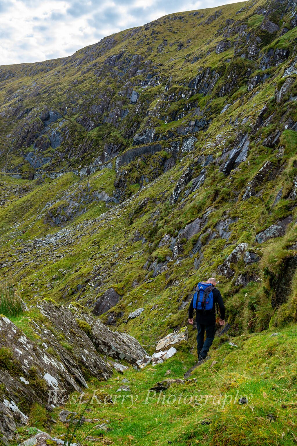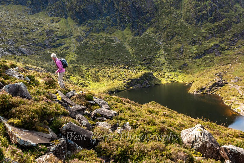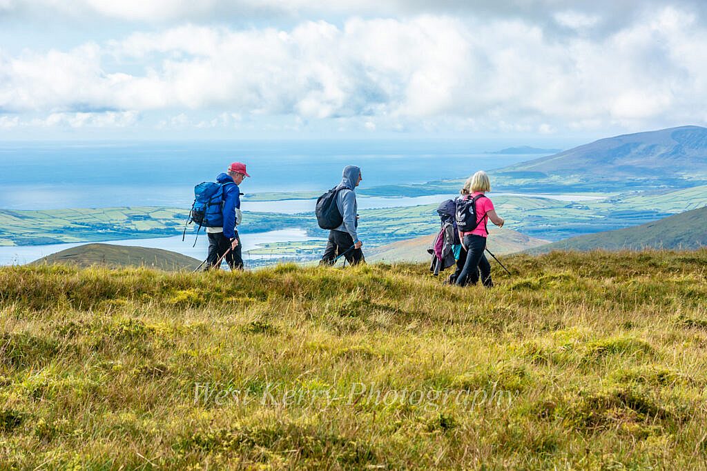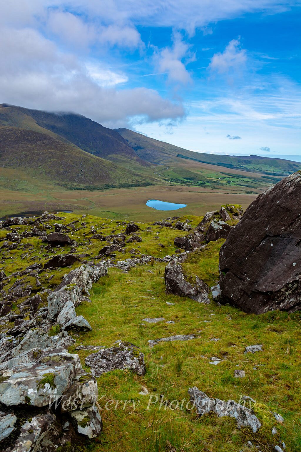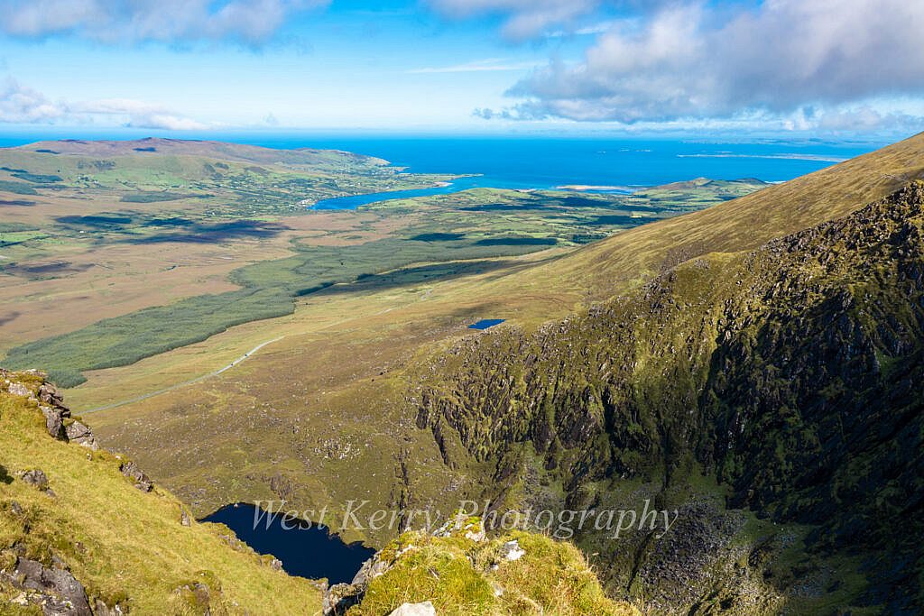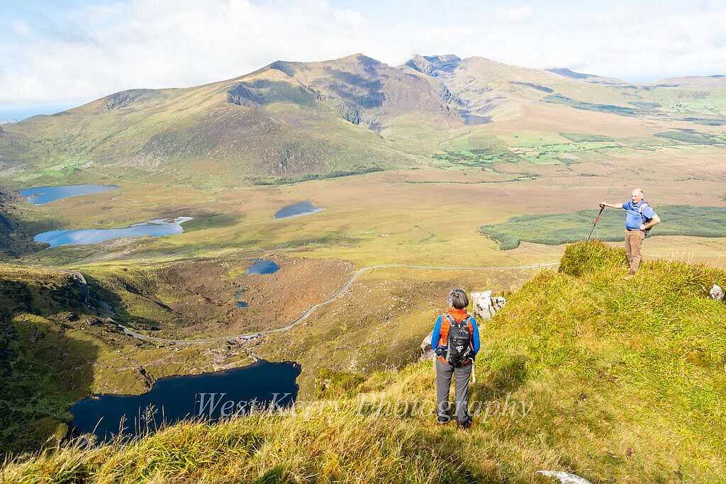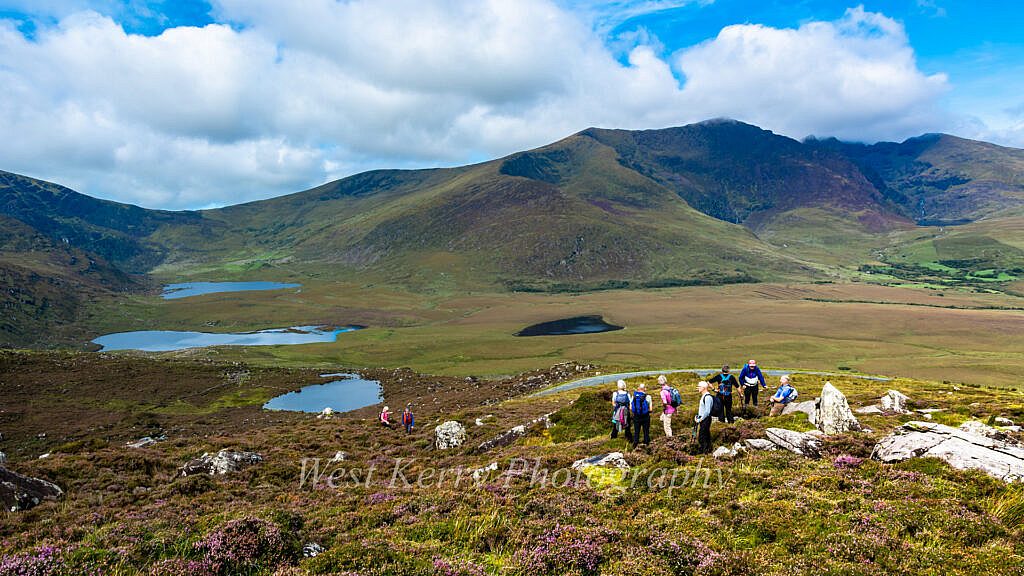 Skirting to the left of this lake we begin our ascent of the shoulder to the left of Pedlars Lake, which leads to Sliabh Mhacha Ré at 620 metres; the highest point of the day. From here the walk descends about 50 metres to the plateau before continuing to Cruach Sceirde (608 mts) where we are rewarded with great views south over Dingle Bay towards the Iveragh Peninsula, west to the Skelligs and east to Castlemaine Harbour.