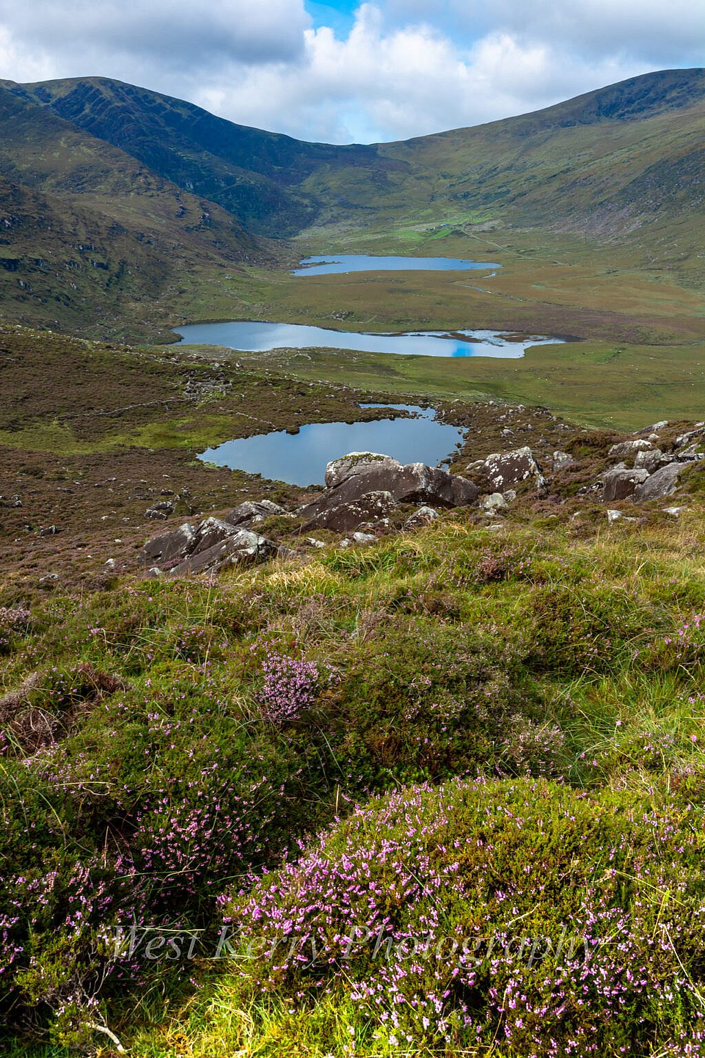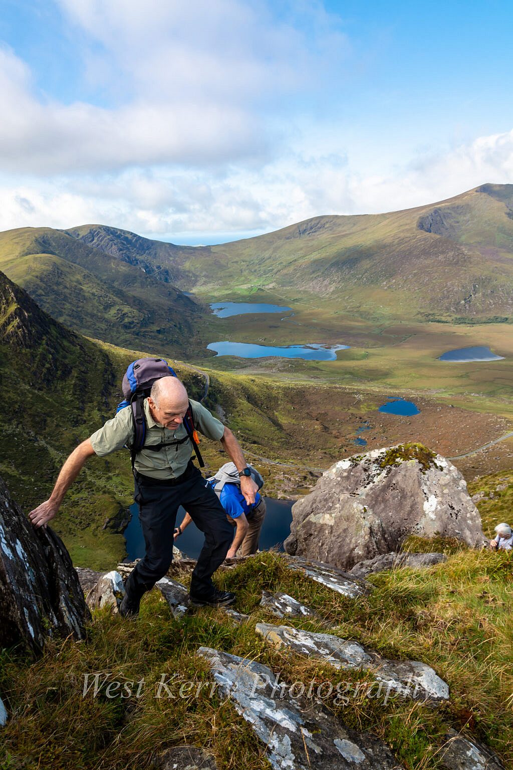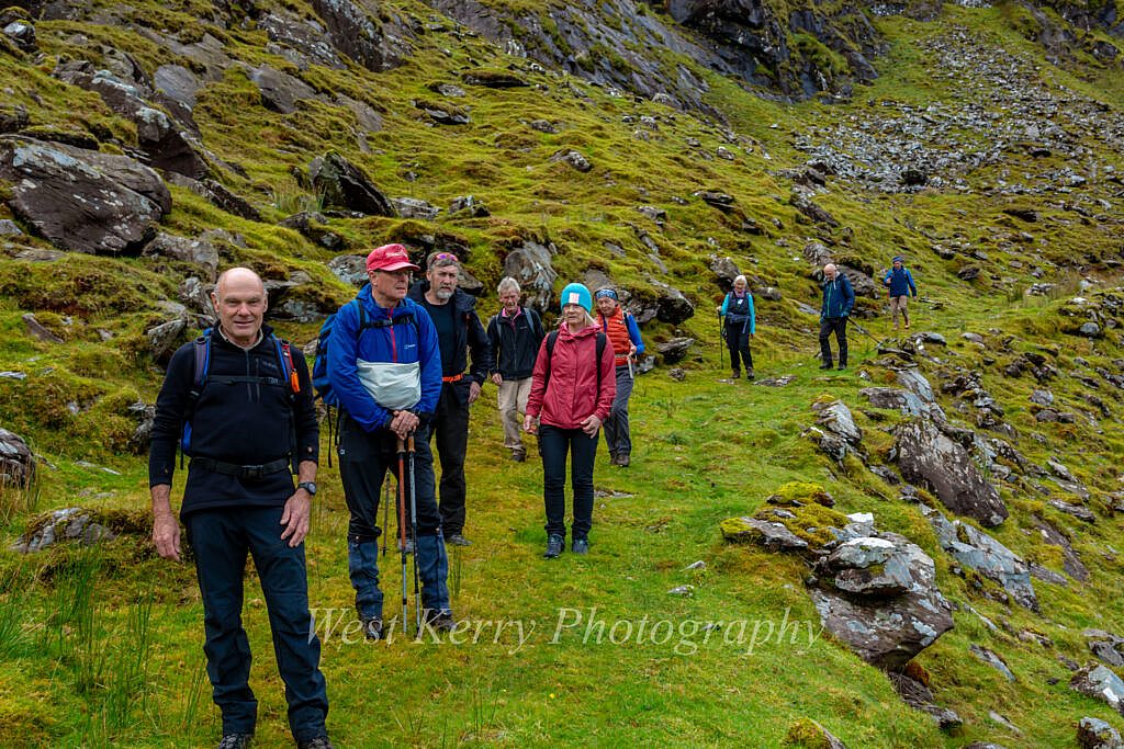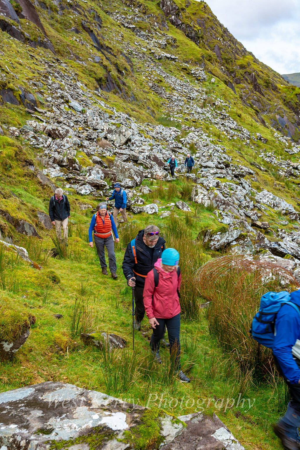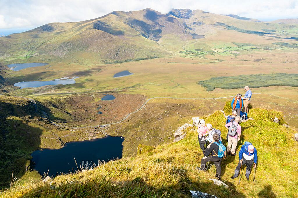 Skirting to the left of this lake we begin our ascent of the shoulder to the left of Pedlars Lake, which leads to Sliabh Mhacha Ré at 620 metres; the highest point of the day. From here the walk descends about 50 metres to the plateau before continuing to Cruach Sceirde (608 mts) where we are rewarded with great views south over Dingle Bay towards the Iveragh Peninsula, west to the Skelligs and east to Castlemaine Harbour.