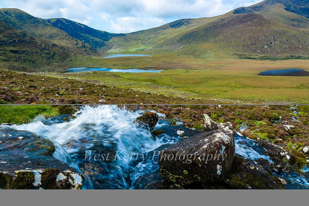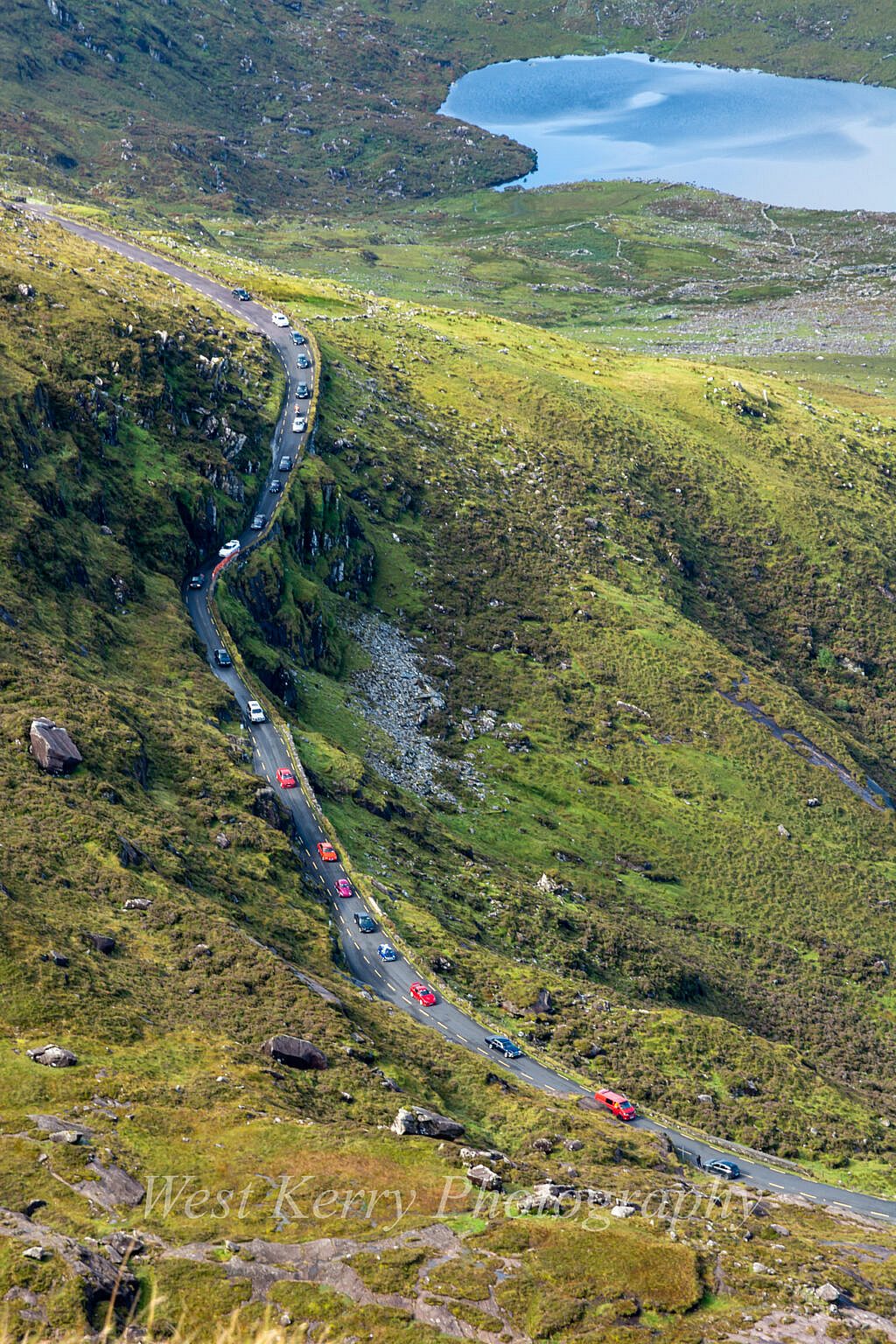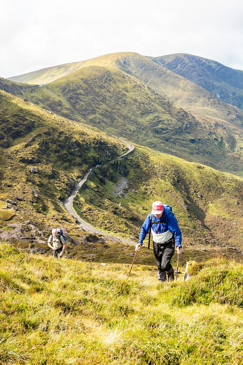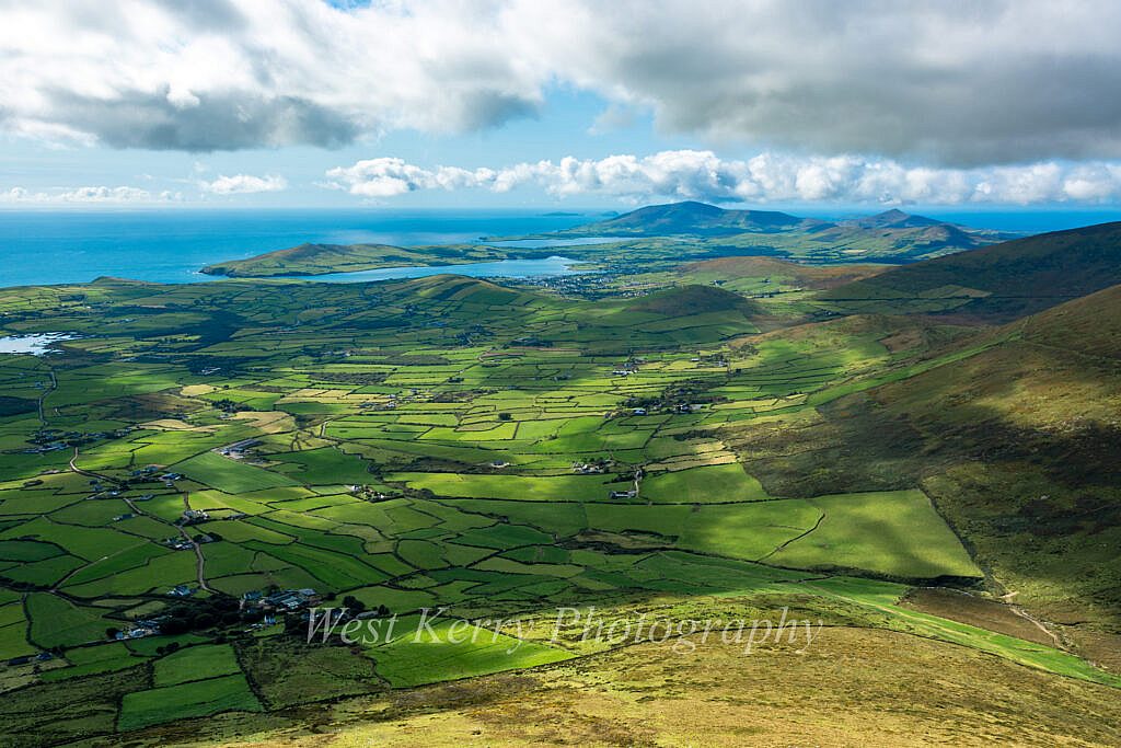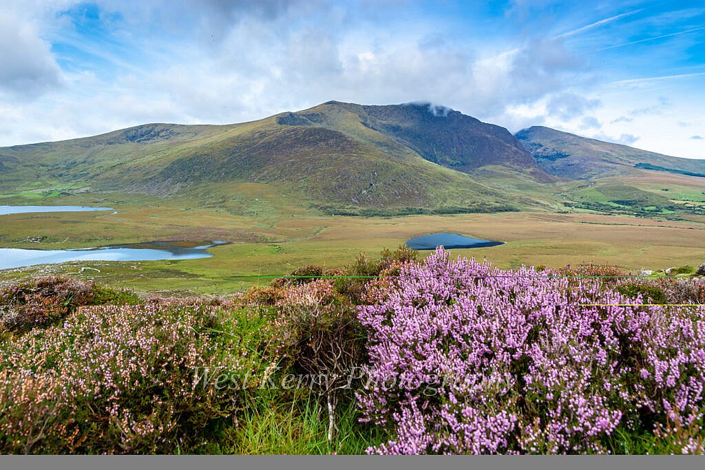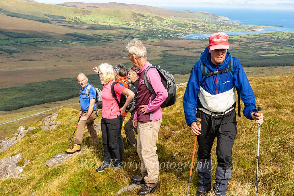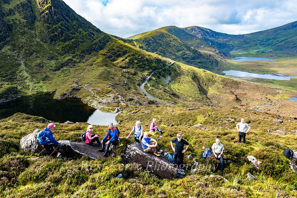 Skirting to the left of this lake we begin our ascent of the shoulder to the left of Pedlars Lake, which leads to Sliabh Mhacha Ré at 620 metres; the highest point of the day. From here the walk descends about 50 metres to the plateau before continuing to Cruach Sceirde (608 mts) where we are rewarded with great views south over Dingle Bay towards the Iveragh Peninsula, west to the Skelligs and east to Castlemaine Harbour.