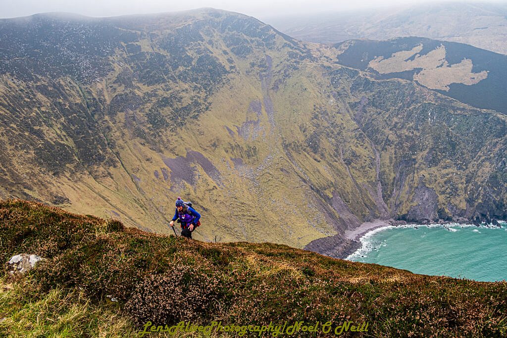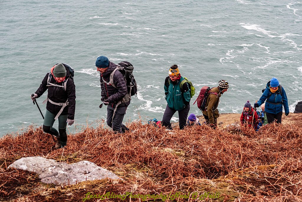 Crossing the river we face a steep climb of approximately 150m along the ridge of the northern side of Cnoc Dúiléibhe before dropping again to spectacular Sás Creek (Sás = trap) which comes into view. It is hard to imagine that people lived and farmed on its slopes in the early 19th century. Landslip has been a feature in the interim with much of the lower slopes in particular having been washed into the sea.
